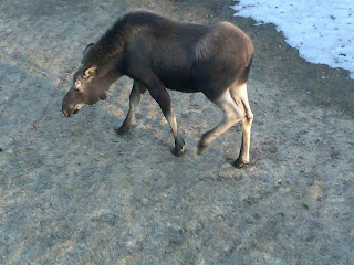 So on the way to the gym tonight Jason yells "MOOSE!" and swings the truck around.. I see no moose and have no idea what hes talking about, then I look all the way back into the woods and there WAY FAR in the back is a baby girl moose... not a real baby, she was last years baby or possibly the years before baby.. but she still wasn't really that big.. compared to other moose! So off to the gym we go!